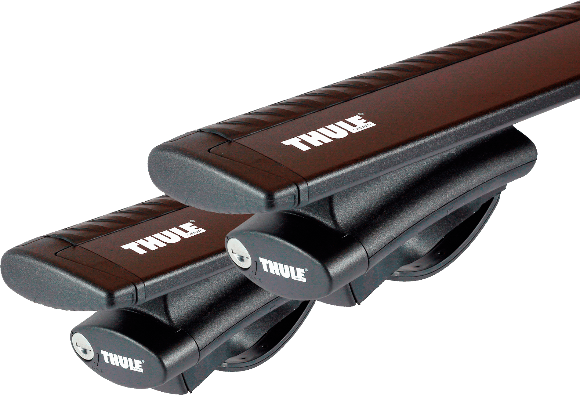 Комплект 4 упора 2 поперечины 4 личинки блокировки 2 ключа (две коробки) Грузоподъёмность - до 75 кг. в паре Вид монтажа на крышу авто - продольные дуги |