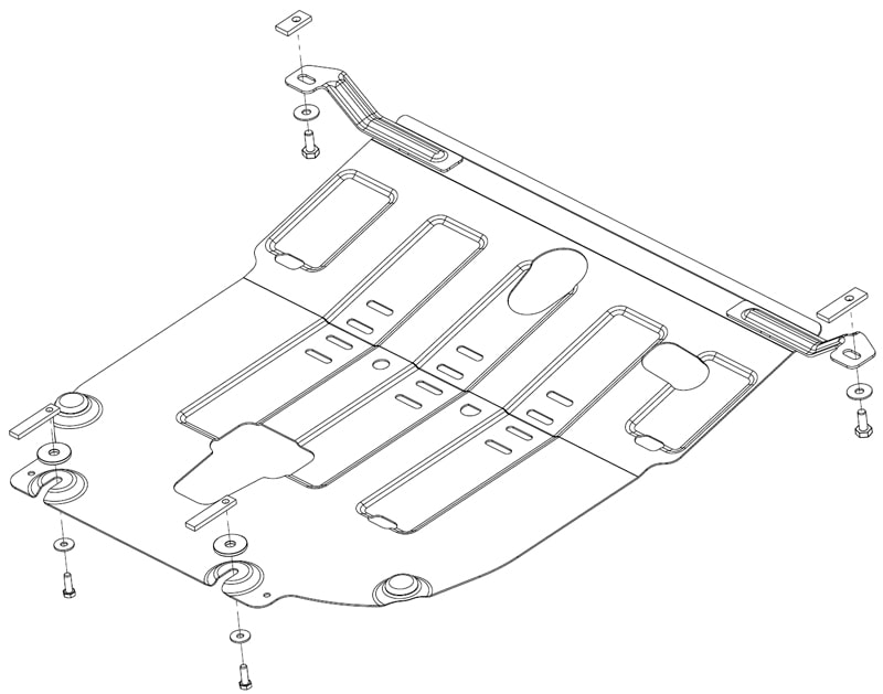 Разработка защит картера «Шериф» ведется с учетом индивидуальных конструктивных особенностей автомобиля, установка осуществляется только на штатные отверстия с использованием качественного крепежа.