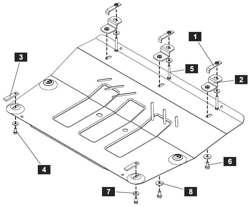 Разработка защит картера «Шериф» ведется с учетом индивидуальных конструктивных особенностей автомобиля, установка осуществляется только на штатные отверстия с использованием качественного крепежа.