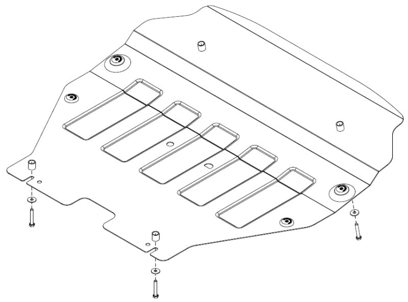 Защита картера разрабатывается с учетом индивидуальных особенностей автомобиля. Её конструкция зависит от типа кузова, объема двигателя, типа КПП, комплектации и прочих параметров.