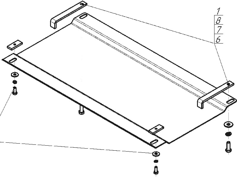 Установить на продольные балки передней подвески задние точки крепления Защиты при помощи ПР 50х20х6 М8, Болтов М8х20, Гроверов 8 и Шайб 8.